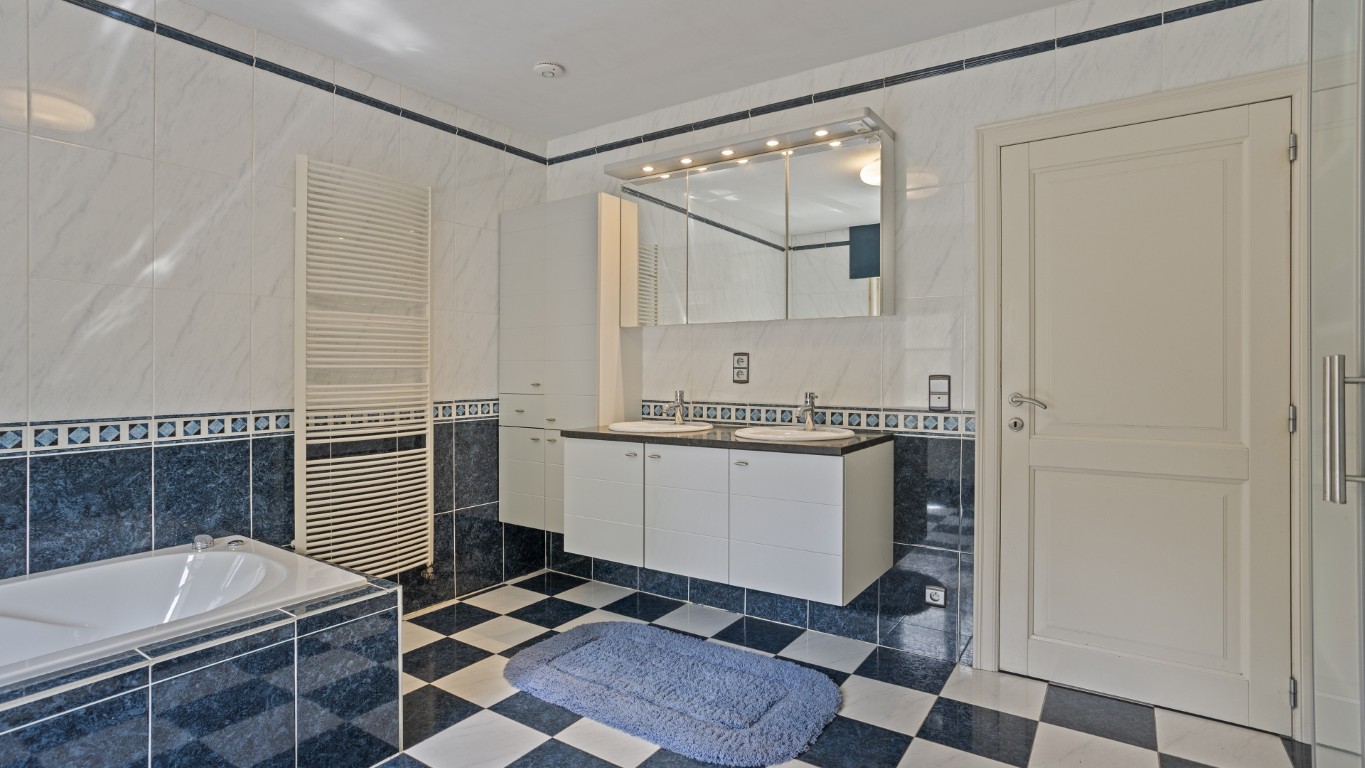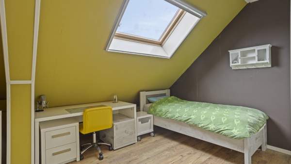 Op de eerste verdieping ontdek je een apart toilet, 2 ruime slaapkamers van circa 22m² en 16m², een hobbykamer, een ruime mooie badkamer met dressing, dewelke is uitgerust met onder andere een ligbad, een douche en een dubbele lavabo met meubel. Verder omvat de afgewerkte zolderverdieping naast een berging 3 mooie slaapkamers met dakramen en elektrische rolluiken. Een zolderruimte werkt het geheel af.