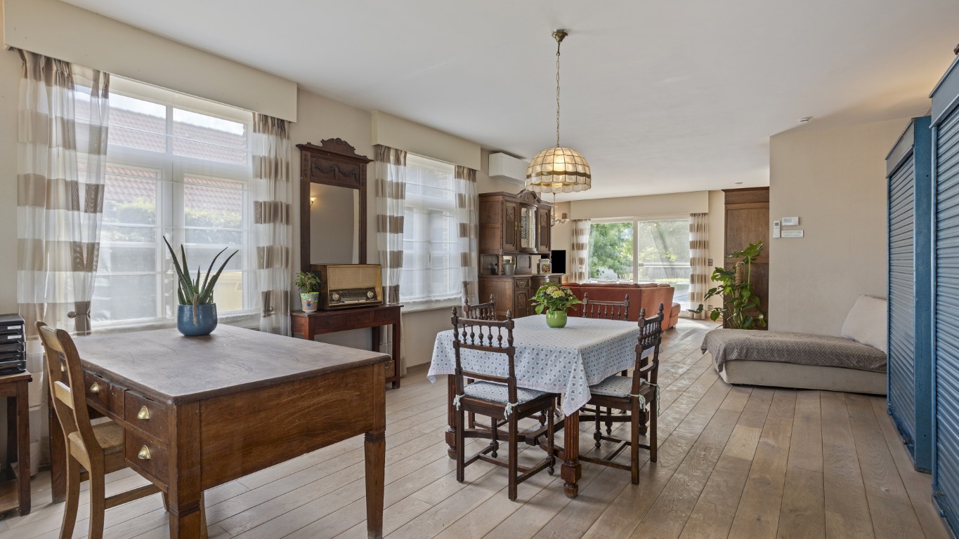 De leefruimte omvat een ruim salon met daarnaast de keuken. De eetplaats maakt verbinding tussen de keuken en het aangename terras met zicht op de diepe tuin en het verwarmd zwembad.
