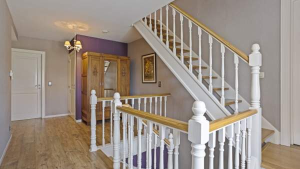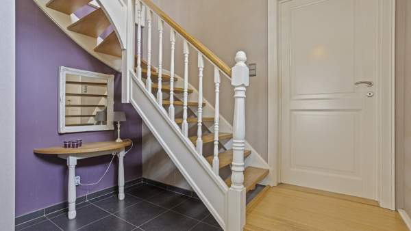 Langs de mooie inkomhal met stijlvolle trap, een apart toilet en een niveau hoger gelegen bureau, kom je in de ruime lichtrijke woonkamer die gezelligheid ademt, uitgerust met volle eiken parketvloer, grote raampartijen en een sfeervolle houtkachel.