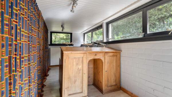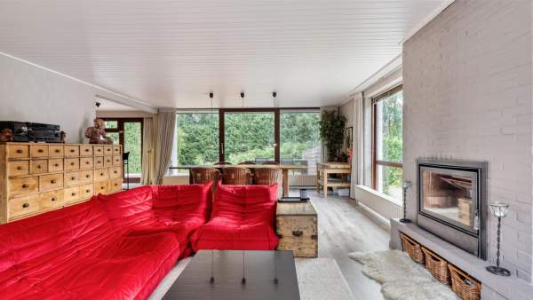 Indeling: Overdekte inkom met toegang tot de trap naar het woongedeelte en anderzijds tot het zwembad- & sportgedeelte. Via de houten trap bereikt u de lichtrijke leefruimte voorzien van houthaard met inbouwcassette. De grote raampartijen en het schuifraam zorgen voor een directe connectie met de groene buitenomgeving.
