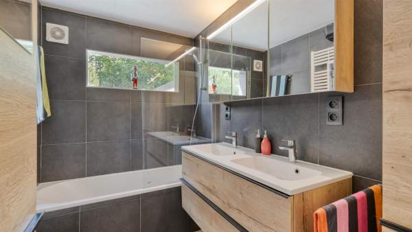 Een half niveau hoger treffen we de hoofdslaapkamer (ca 13,3m²) en nog 3 kleinere kamers (ca 10m² en 2 x ca 8 m²), waarvan 2 zijn uitgerust met maatkasten en desgewenst kunnen worden samengevoegd tot één grotere slaapkamer. De volledig vernieuwde badkamer (‘24) is afgewerkt met hoogwaardige materialen en omvat een ligbad met douche, spiegelkasten, dubbel lavabomeubel , 2 kolomkasten, handdoekdroger en een extra keramische verwarming voor de tussenseizoenen. De bovenverdieping omvat geen dragende tussenmuren en de indeling kan dus vrij eenvoudig worden aangepast naar eigen wens.