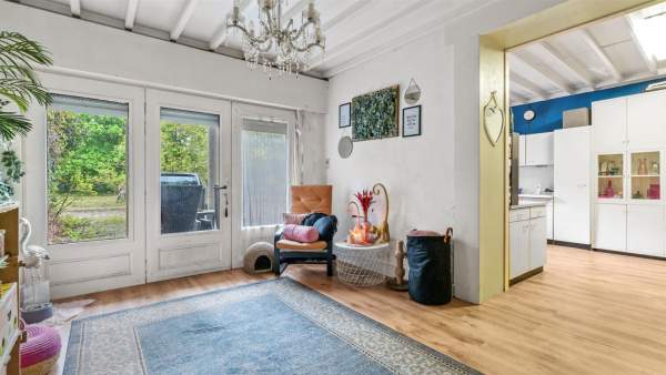 Woonentiteit 3 (gelijkvloers, links - ca. 114,5 m²): woonkamer met pellet kachel, keuken, gang, slaapkamer, badkamer/wasplaats.